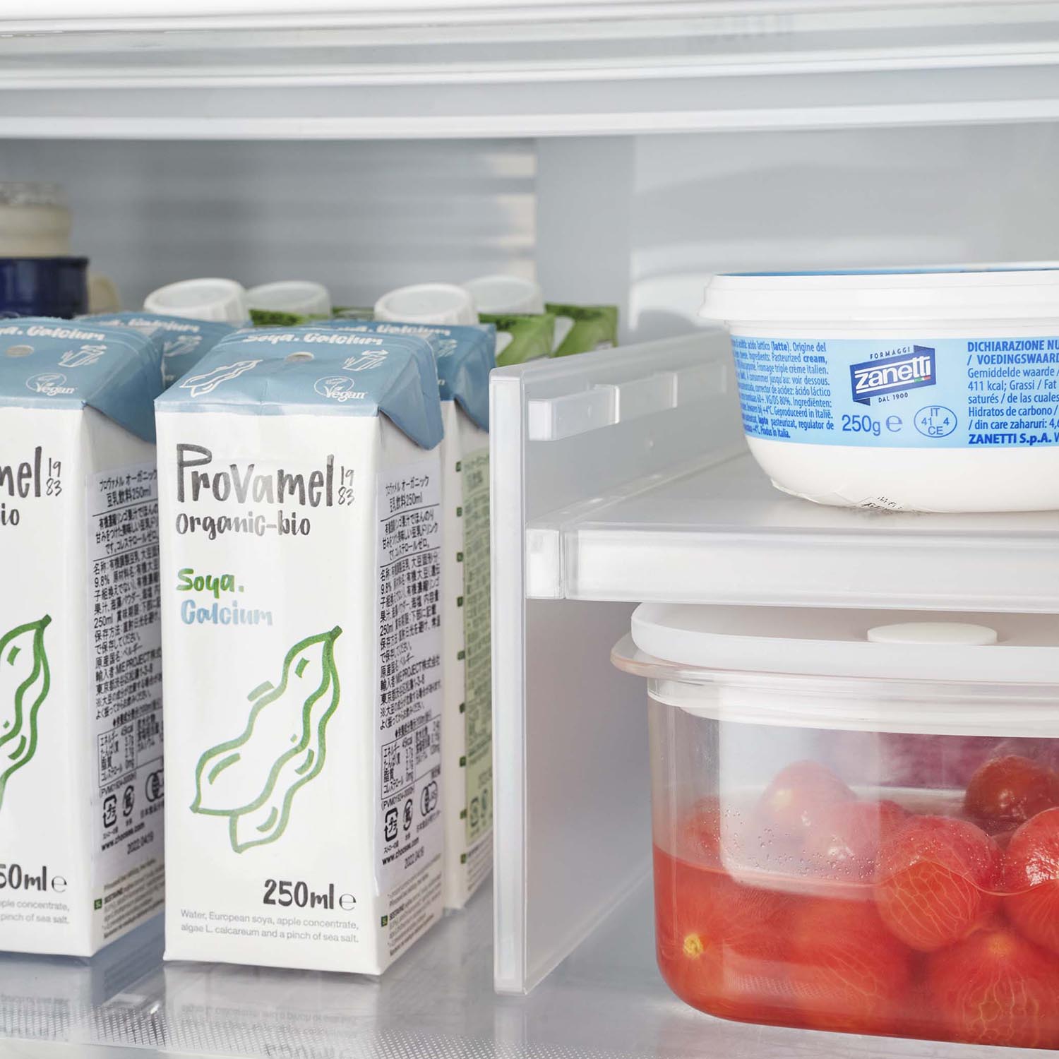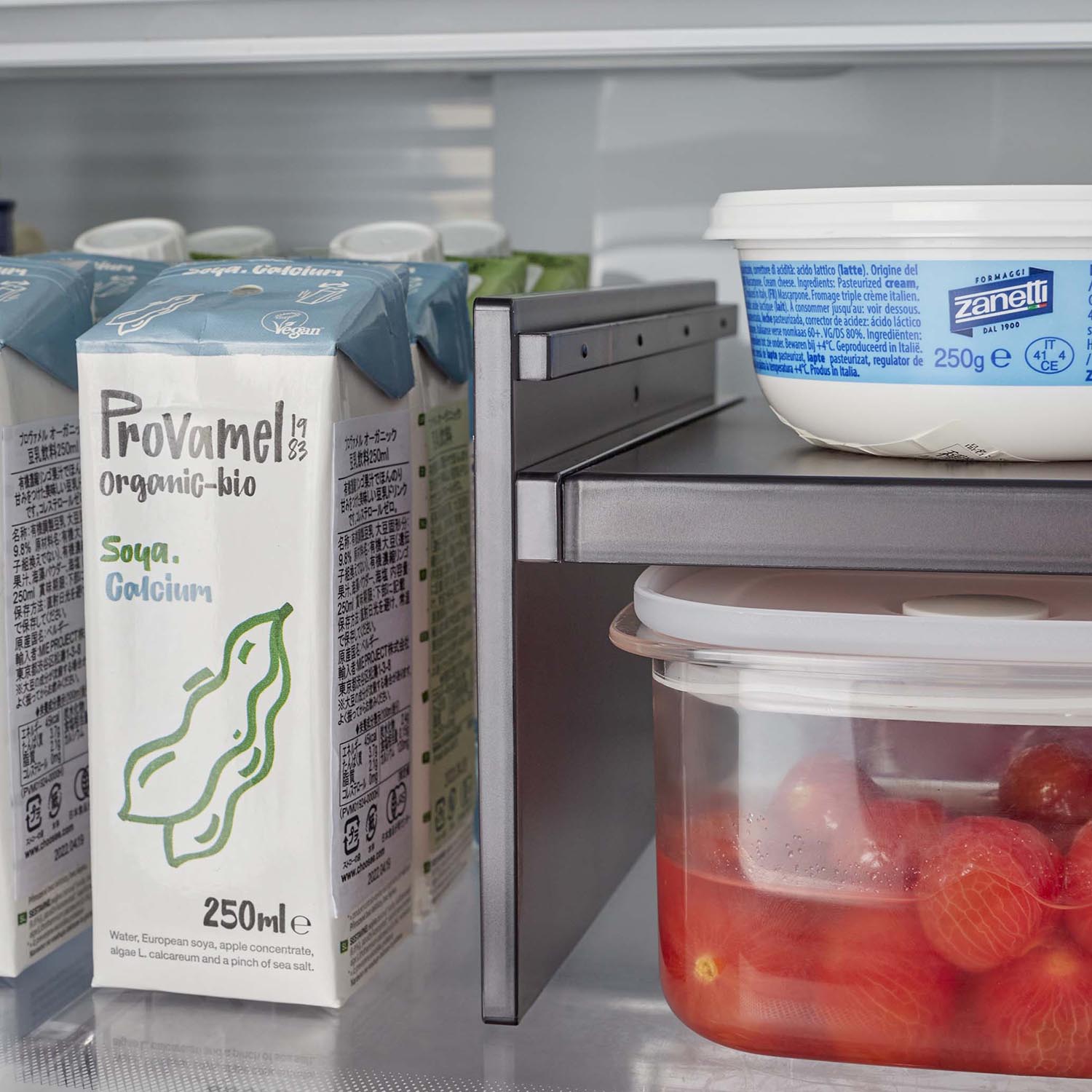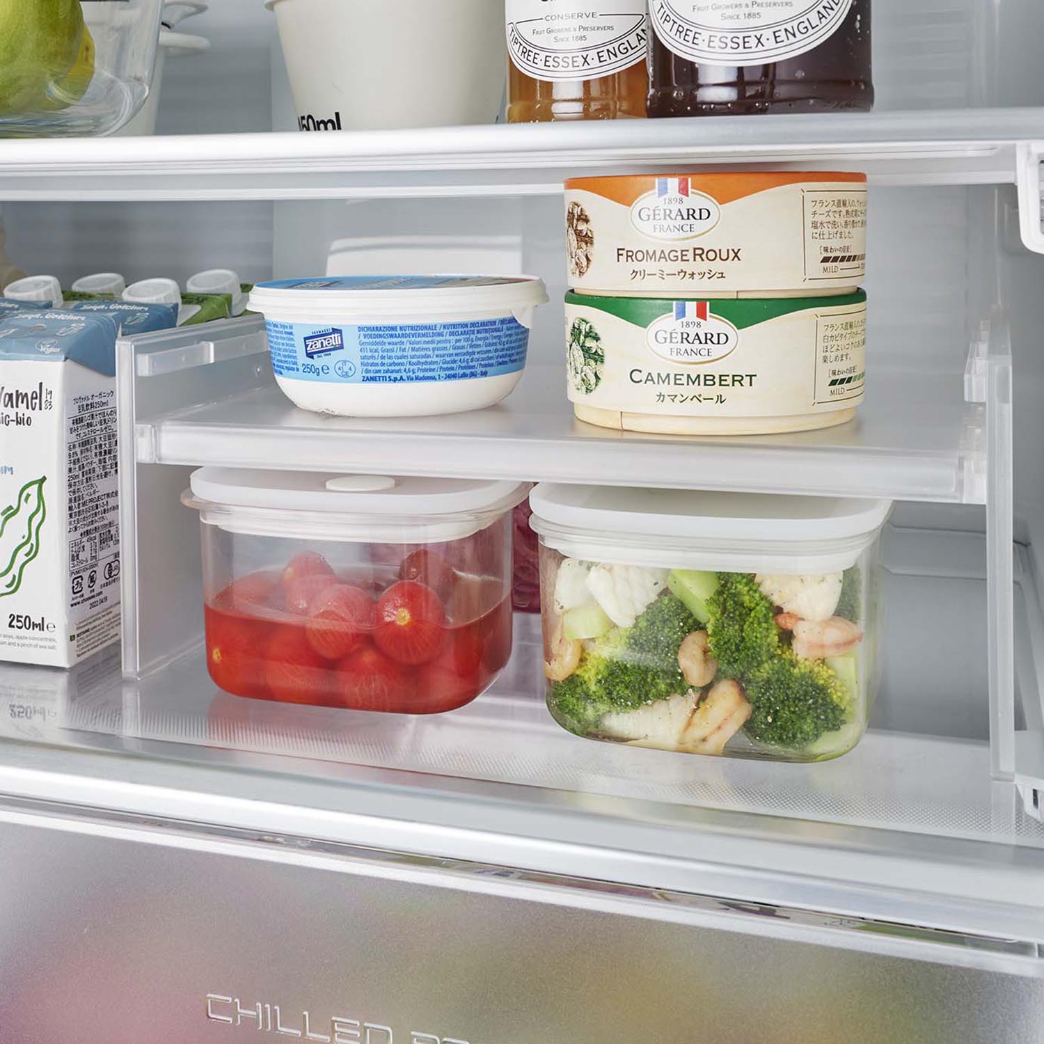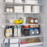 The shelf height can be adjusted in two stages, allowing you to choose the height that best suits your storage needs. It can also accommodate 2L bottles or cold water flasks underneath. Assembly is a breeze - simply slot it in. You can store your prepared Tupperware in the space above without stacking them directly on top of each other.
