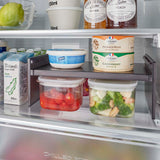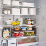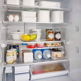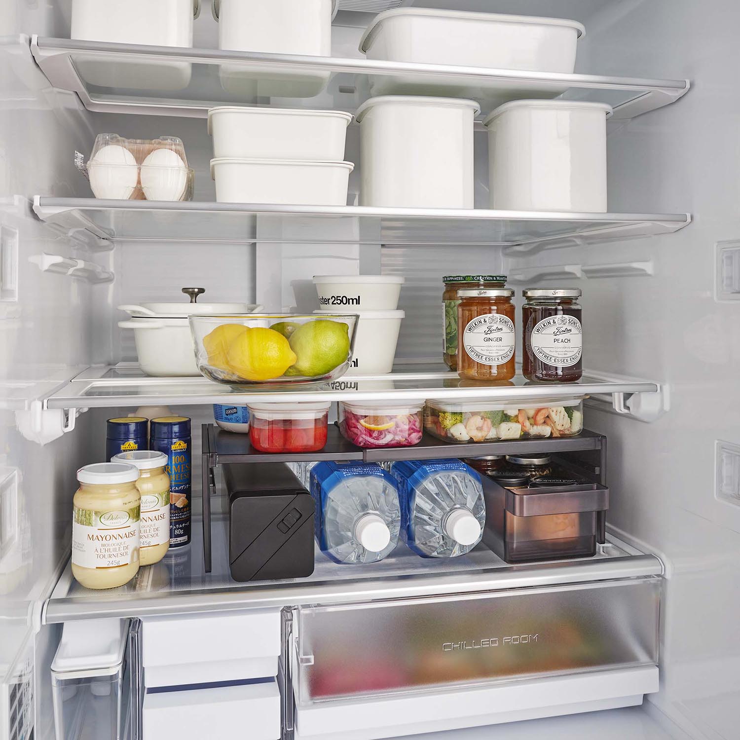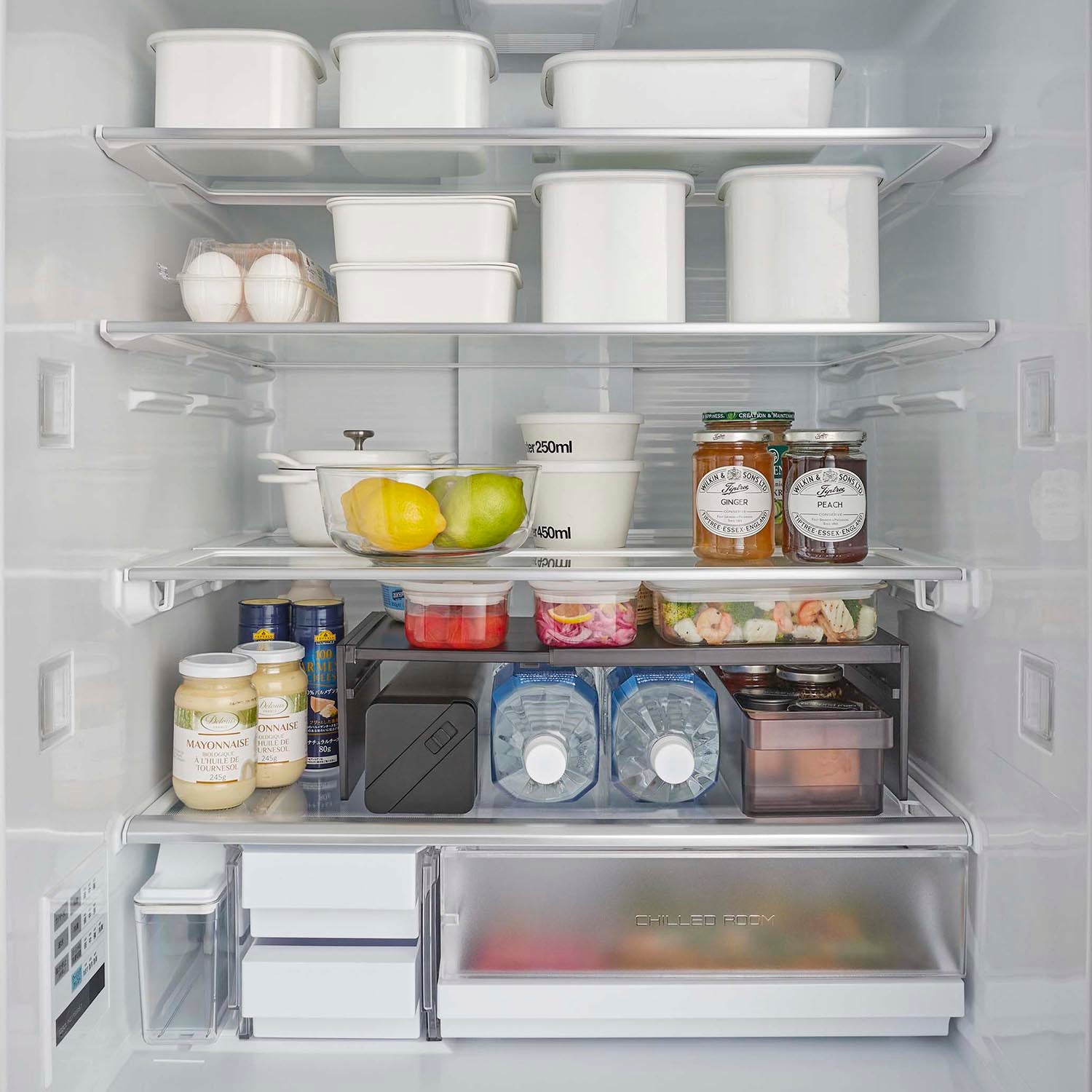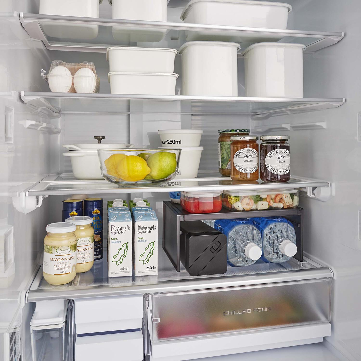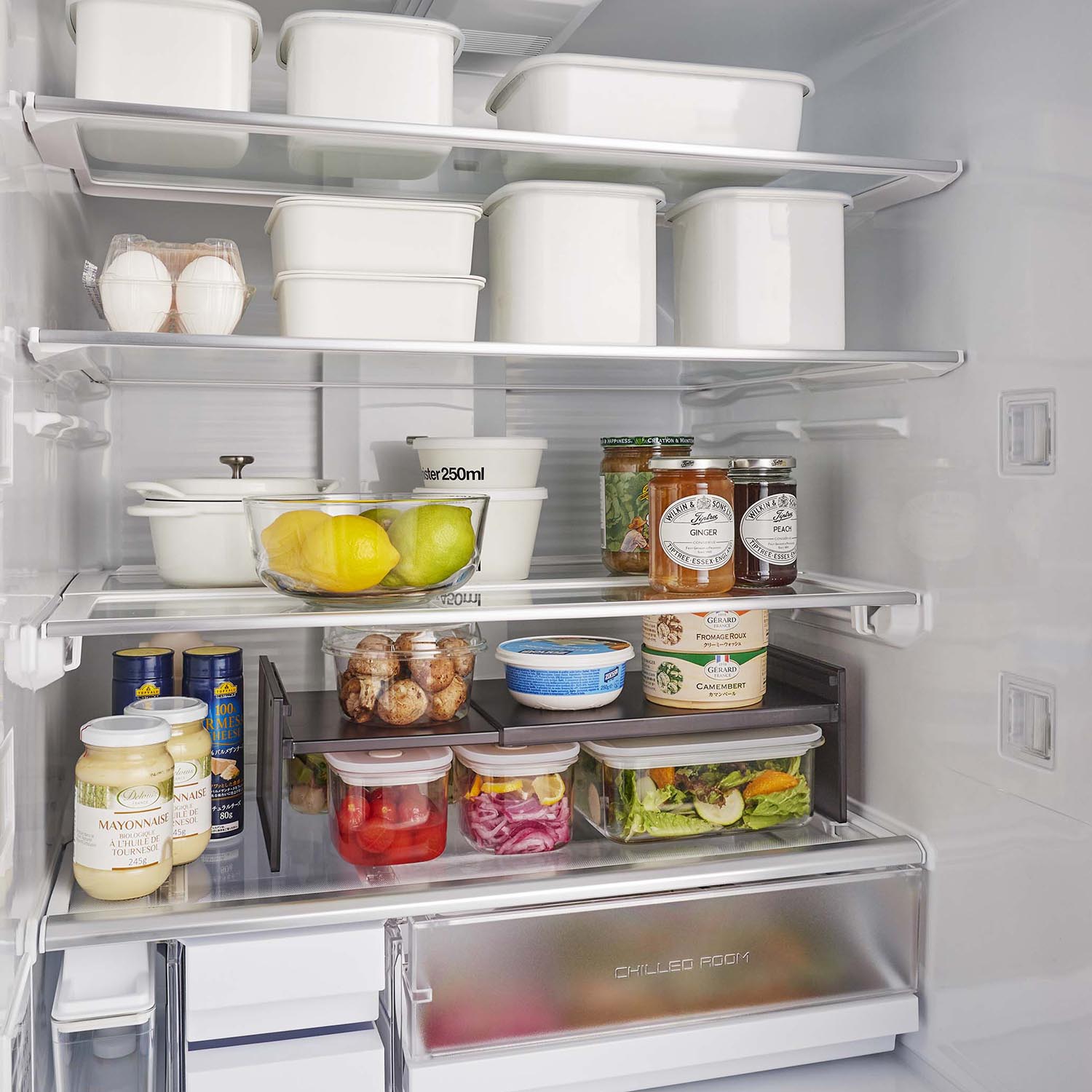 An adjustable, extendable storage rack for inside your fridge, with both width and height settings.