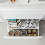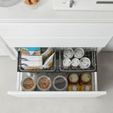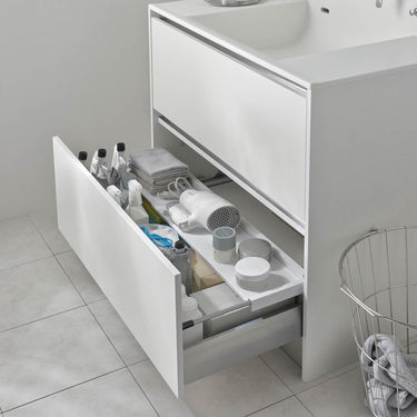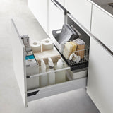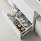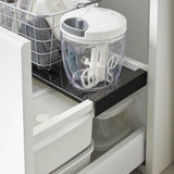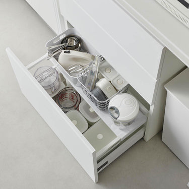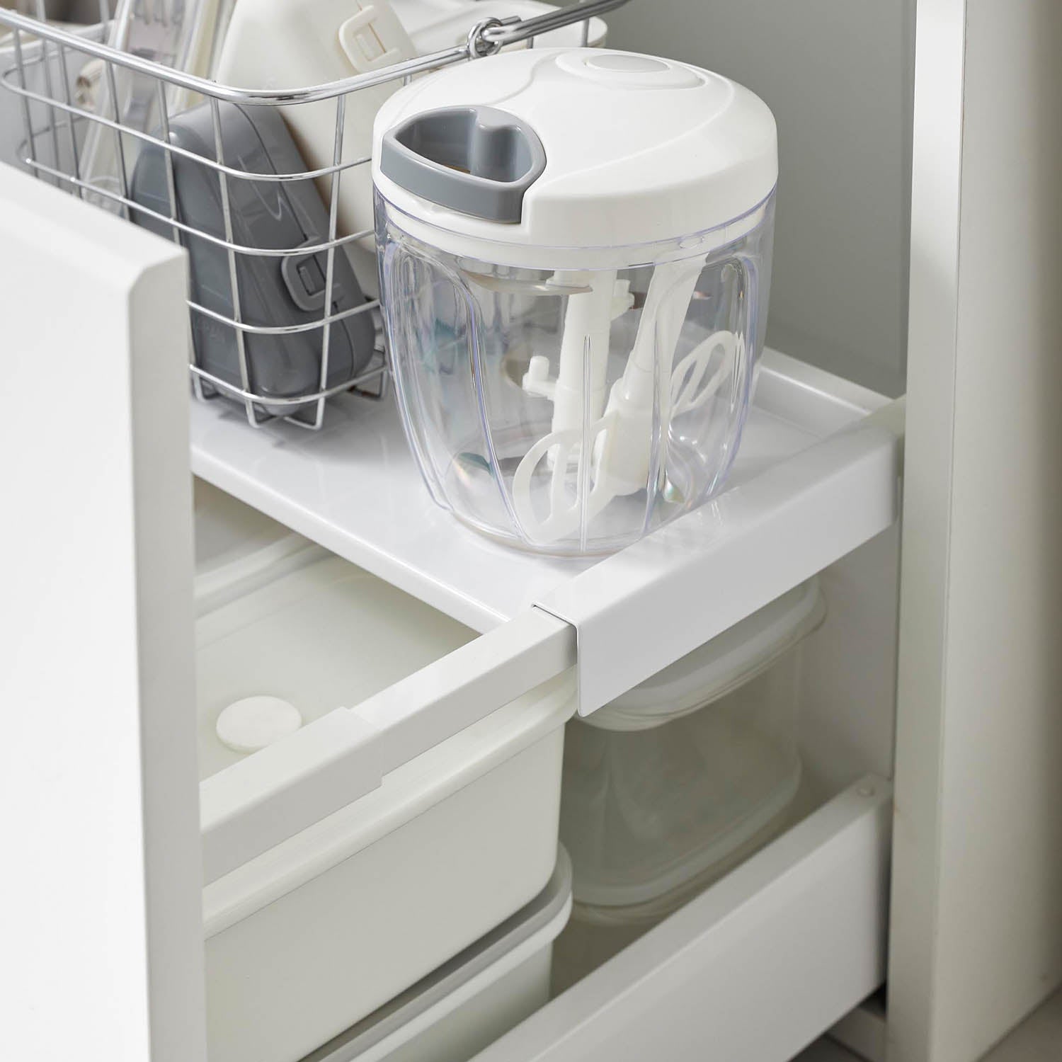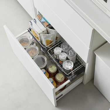 By dividing your everyday items and stock into two levels, you can neatly organise the inside of your drawer. With an adjustable width of 37-64cm, it fits perfectly in your drawer! It's easy to install, simply hang it on the side bar of your kitchen or bathroom drawer. If you install it towards the front of the drawer, you can retrieve items without having to fully open the drawer, which is very convenient! It's also great for storing bulky kitchen utensils, food storage containers, hair dryers and bathroom items.