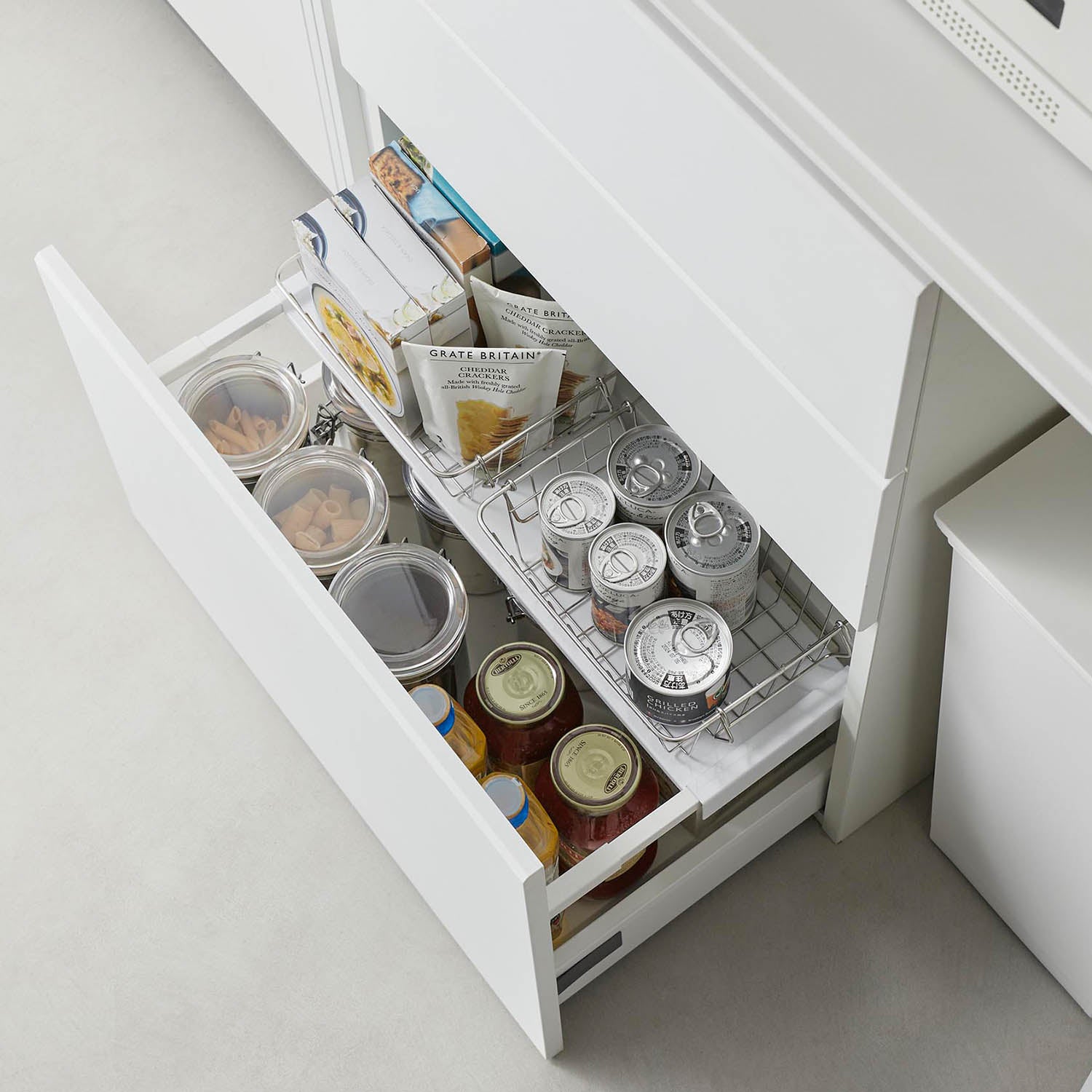 An extendable kitchen rack that effectively utilises the dead space at the top of your drawer storage, enhancing your storage capacity.