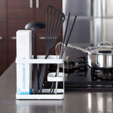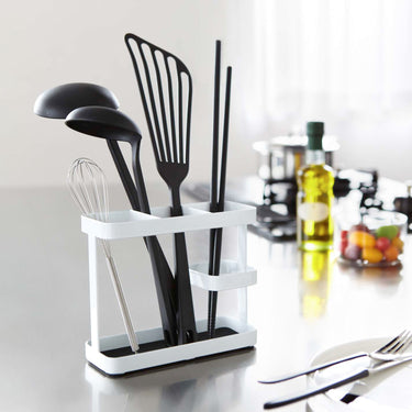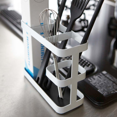A tool stand that allows you to store your kitchen tools compactly. Comes with a two-tiered partition, enabling even short kitchen tools to be stored. Its slim depth makes it possible to place in the back of the stove or in small corner spaces. Can also be used as a wrap stand.