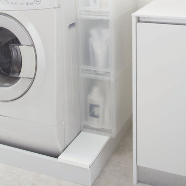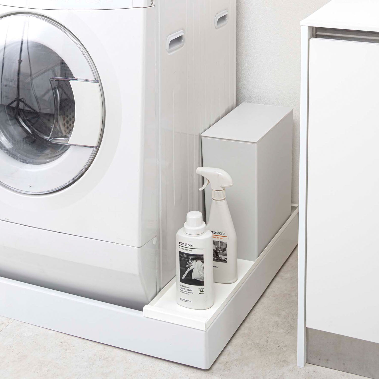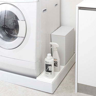 You can simply place it on top of your washing machine's drip pan to create a handy storage space. It conceals the washing machine's drain and hose, also acting as a dust guard. This dual-sided design allows you to choose between the front and back depending on what you're storing and your specific needs. The back side has a guard, making it suitable for placing small items like detergent bottles or rubbish bins. The front side is flat, making it convenient for placing larger items like storage racks.