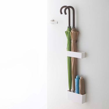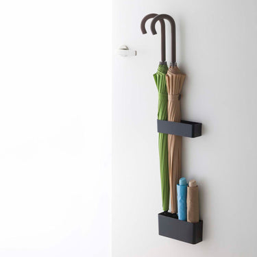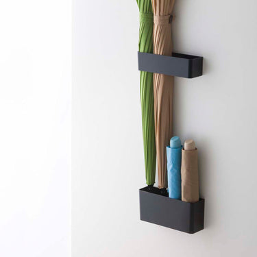 This is a magnetic umbrella stand that attaches to your front door. It's a handy solution for narrow entrances where space for an umbrella stand is limited. It also features a lower holder for storing folding umbrellas.