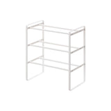 A three-tier shoe rack with adjustable width. It can hold up to approximately 12 pairs of men's shoes, or up to 16 pairs of women's heels. You can stack up to two of these units.