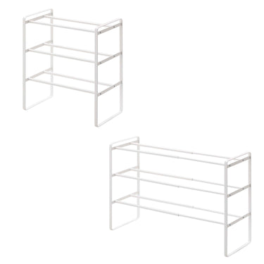 A 3-tier shoe rack with adjustable width that can be expanded or contracted.
