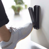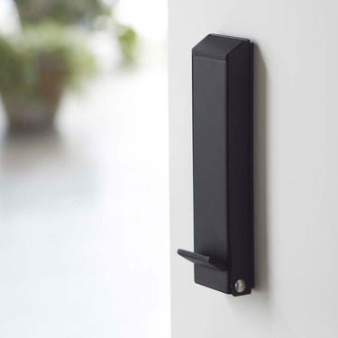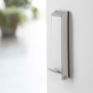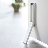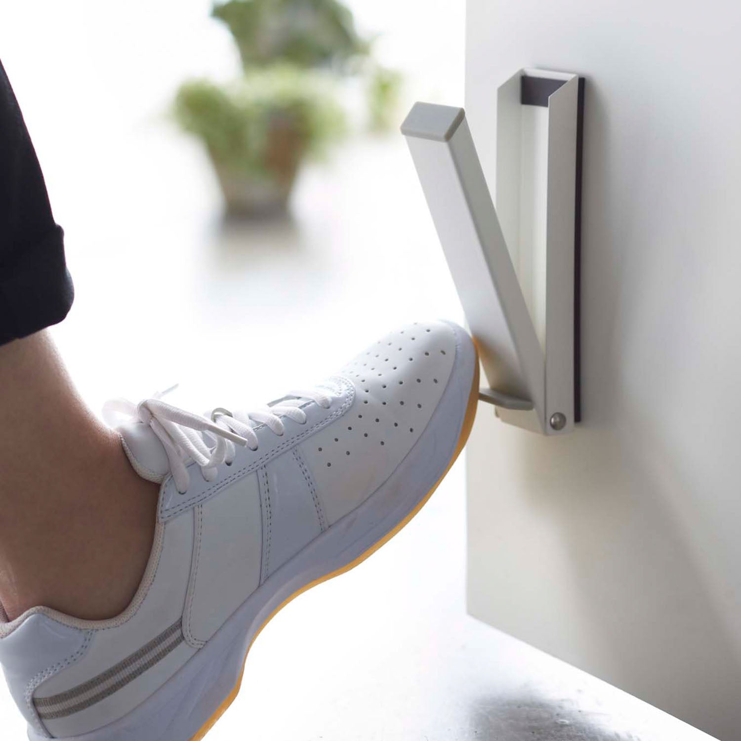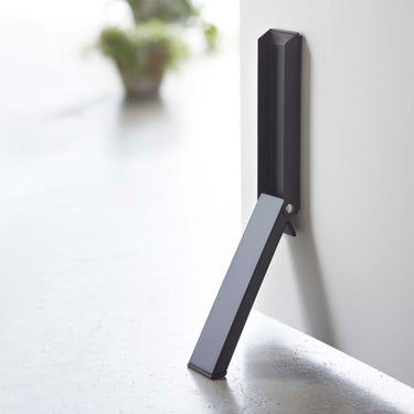 A door stopper that can be easily attached to steel doors with a magnet and can be opened and closed with one foot. Simply press down with one foot to secure the door. When not in use, it folds up for a slim profile.