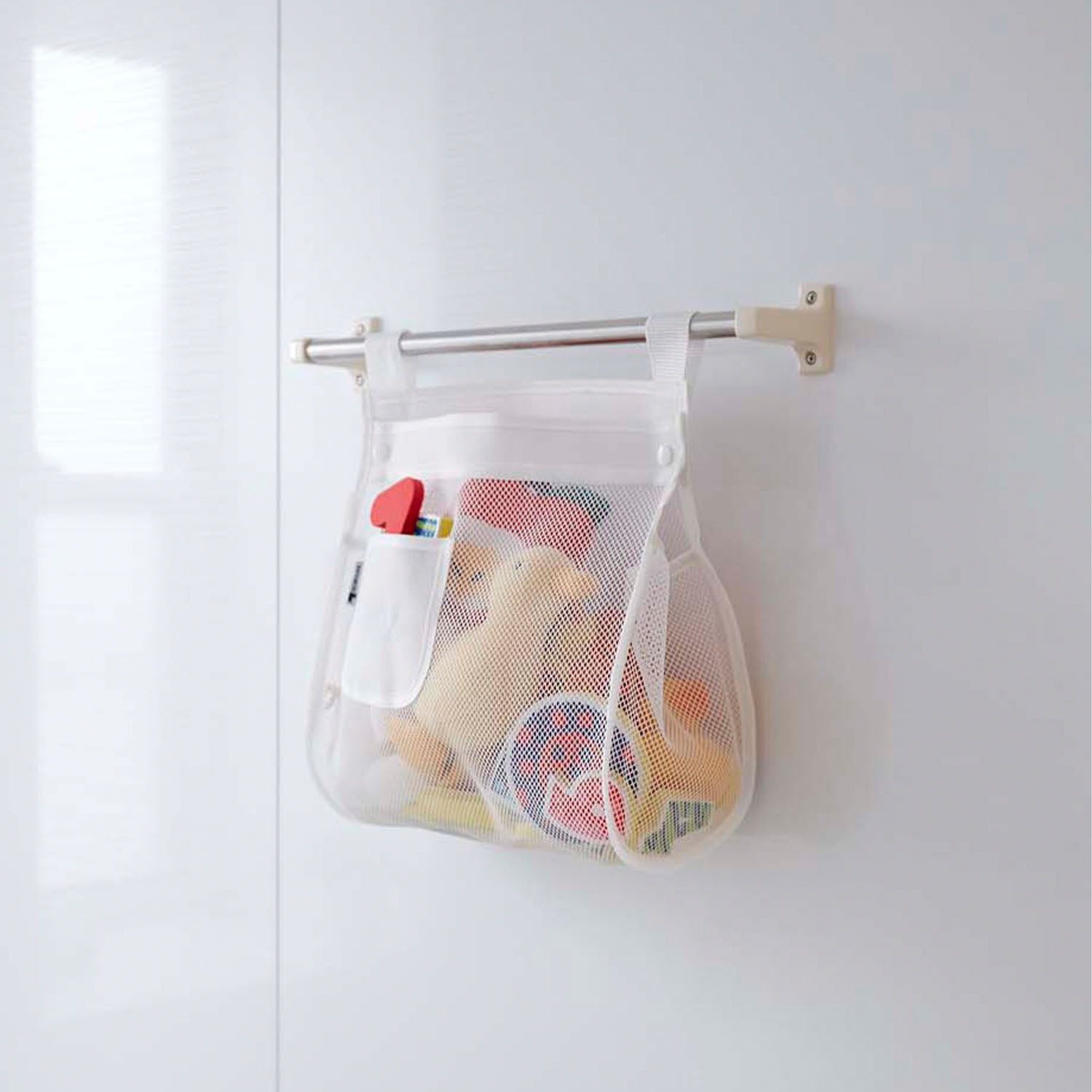 Keep your child's bath toys, which tend to pile up in the bathroom, neatly and cleanly stored. By placing them in a mesh bag and hanging it up, you can drain the water from the toys, keeping them always in a clean condition. It's also perfect for organising other bathroom items. You can choose between two ways to attach it to your bathroom, using suction cups or Velcro.