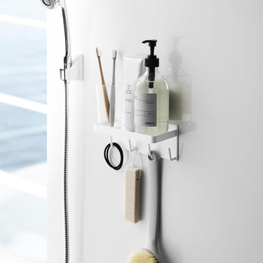 A rack and hook set that easily attaches to bathroom walls where magnets can stick.