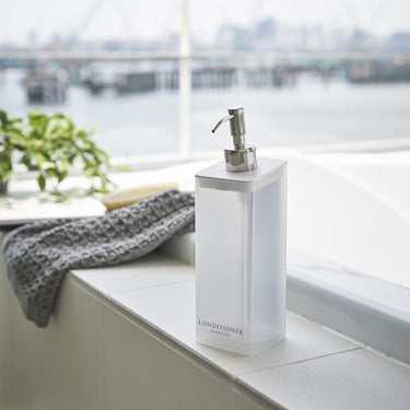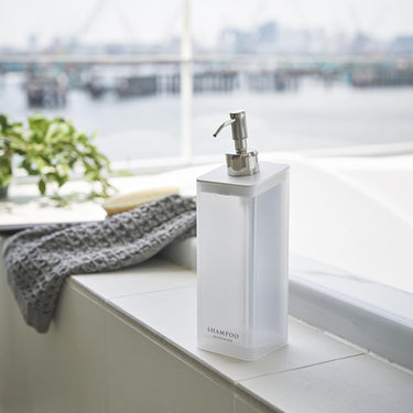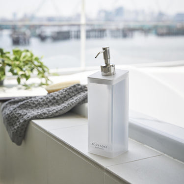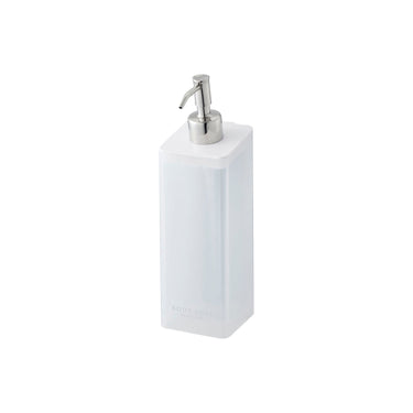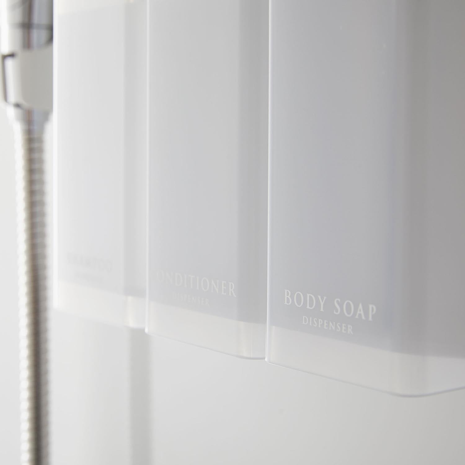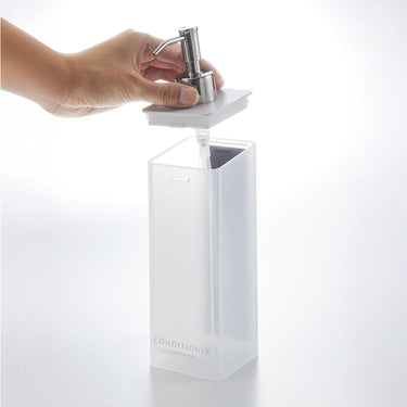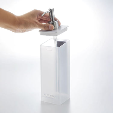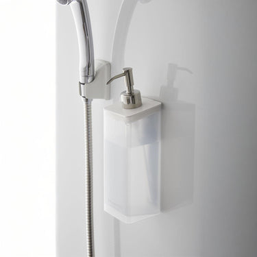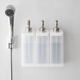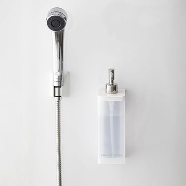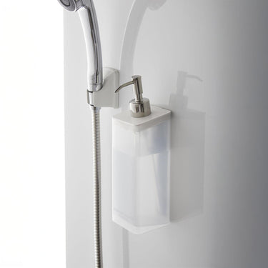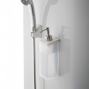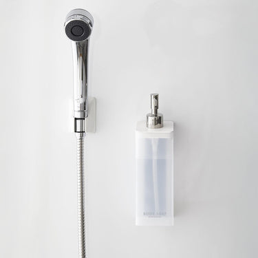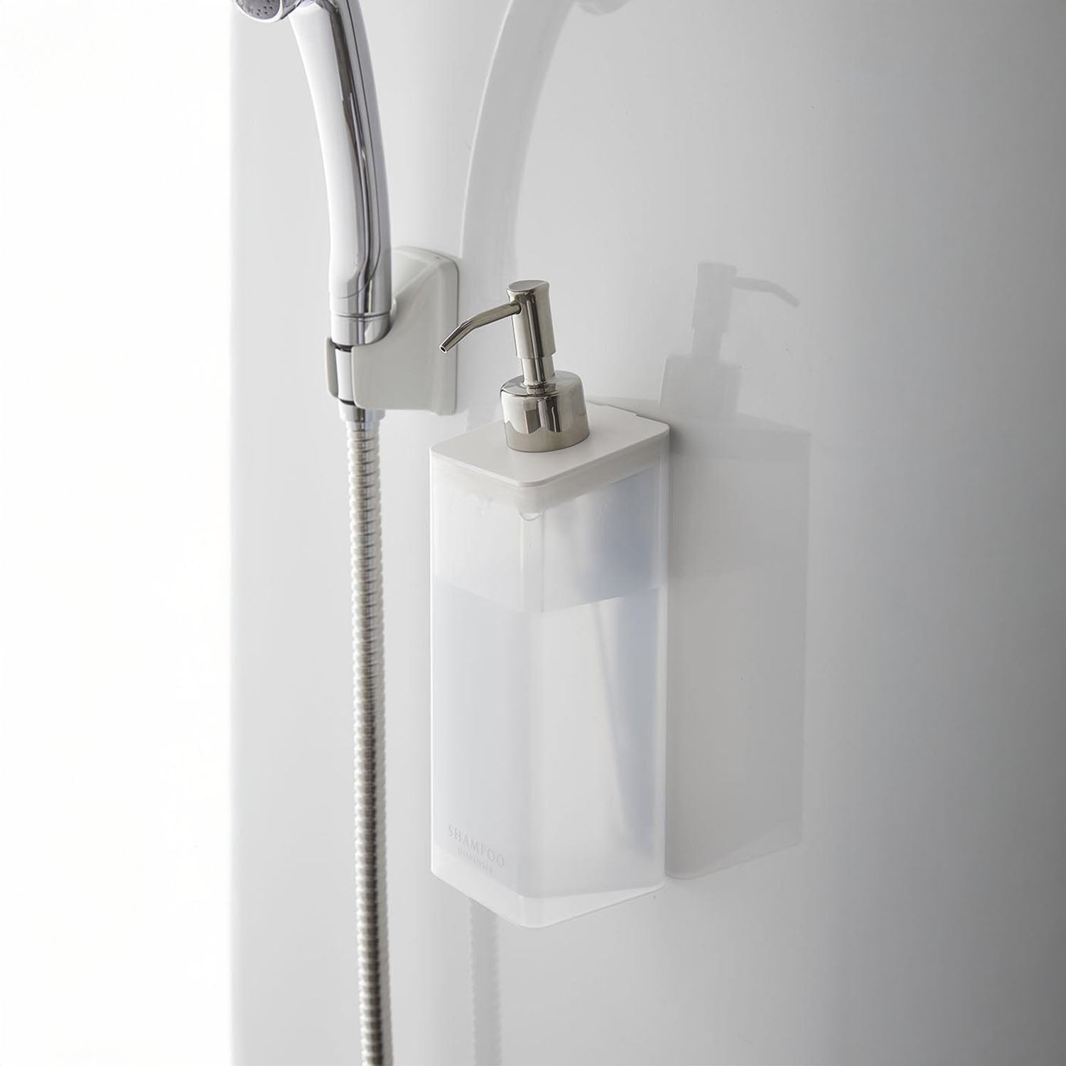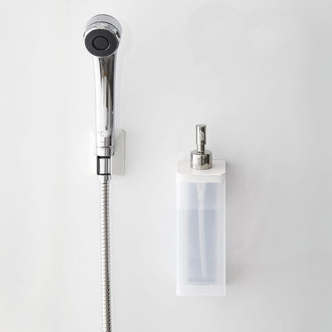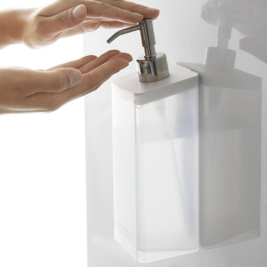 A dispenser bottle that easily attaches to your bathroom wall with a magnet. Simply press the pump to dispense the liquid. The lid comes off, making it easy to clean and refill. It can accommodate refill bags as they are.
