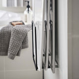 A convenient bath lid stand that can be attached to the bathroom wall with a magnet.