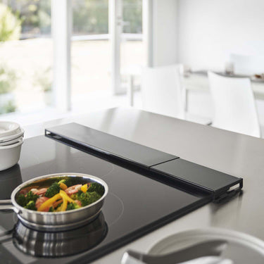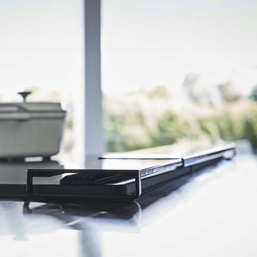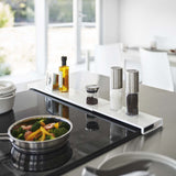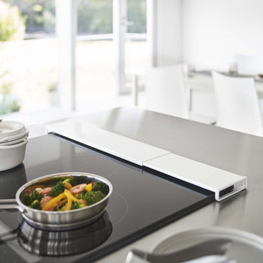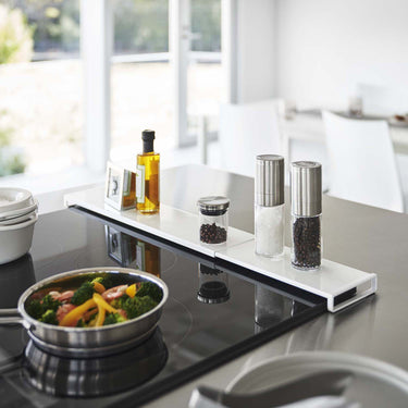 Just place it on the exhaust vent! It effectively guards against splattering oil and cooking grime. This flat type cover is low in height, making it hard for cooking waste to get in and it blends in stylishly without standing out. It neatly covers the exhaust vent and can also be used to place condiments. It's perfect for temporarily placing pots and pans. Being a low-height flat type, it's inconspicuous and stylish. It's extendable, allowing it to fit perfectly to the width of your stove.