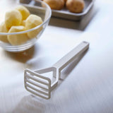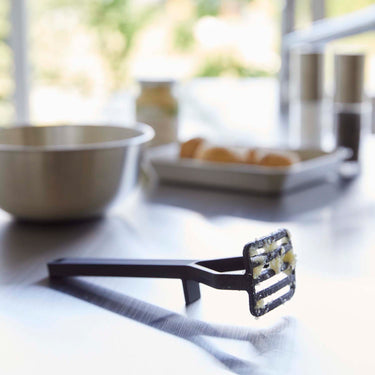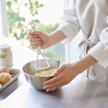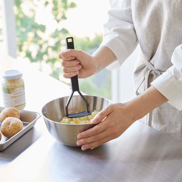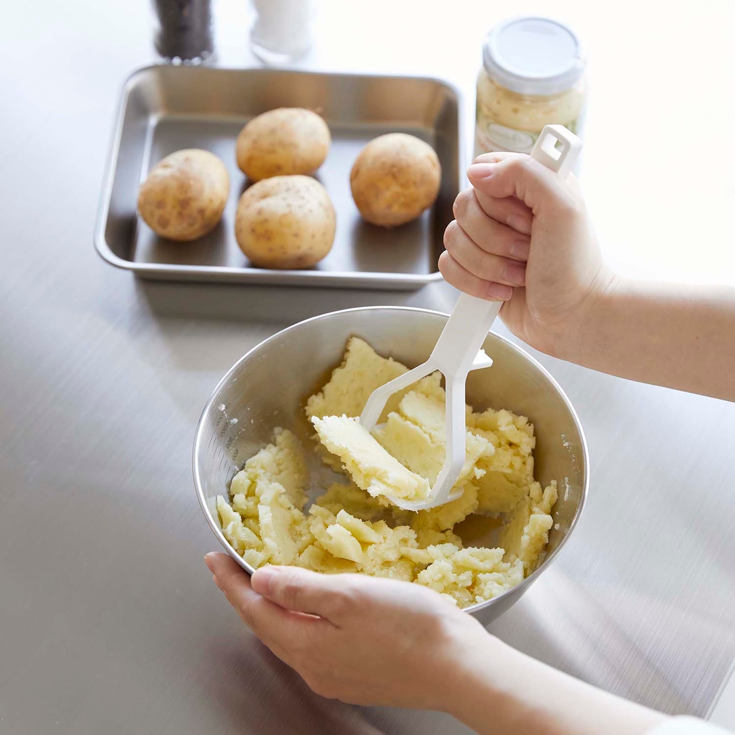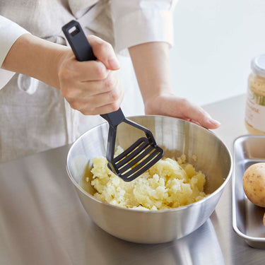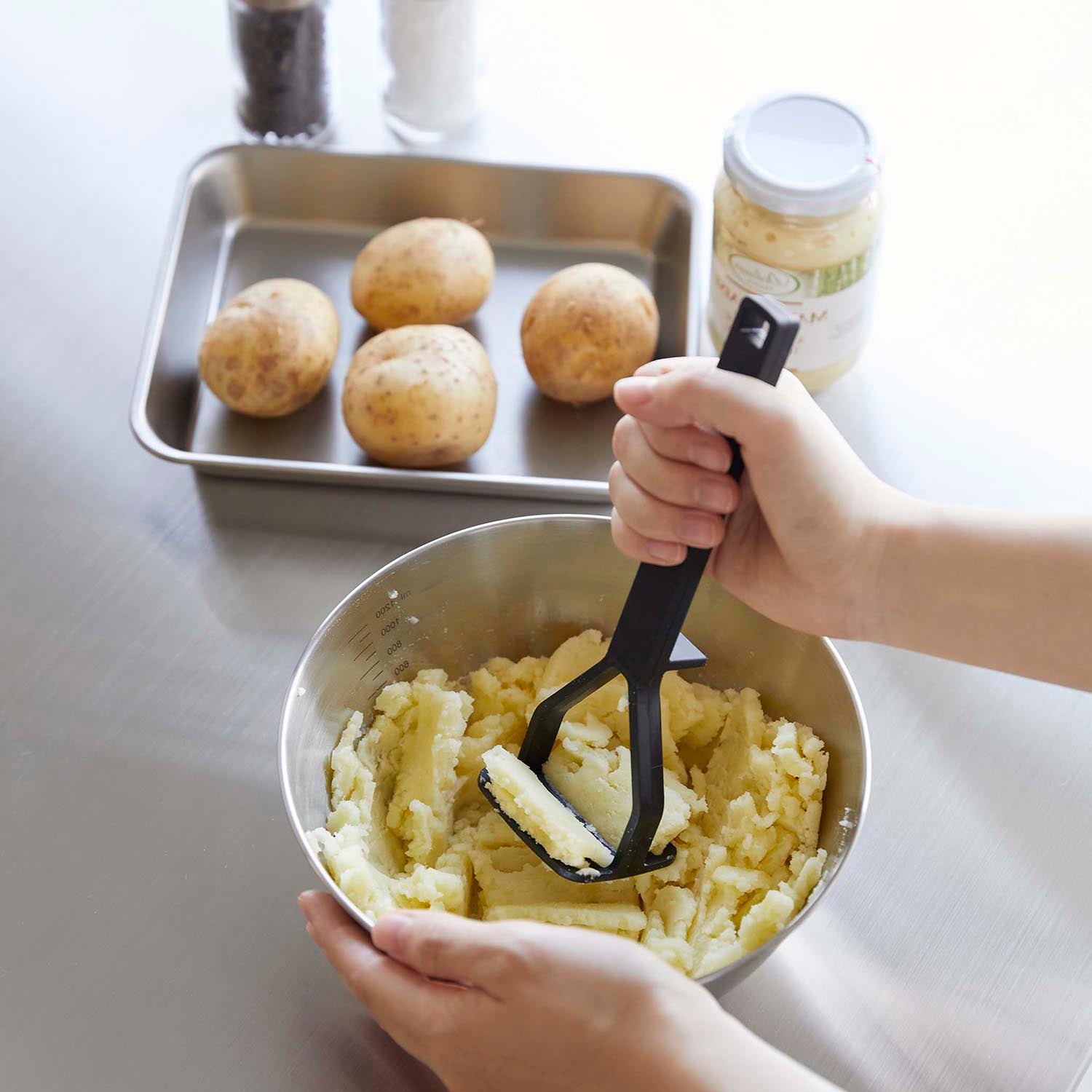 A potato masher with a silicone handle that's easy to hold and perfect for mashing boiled potatoes.