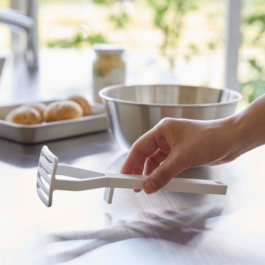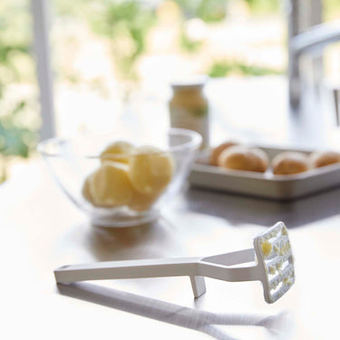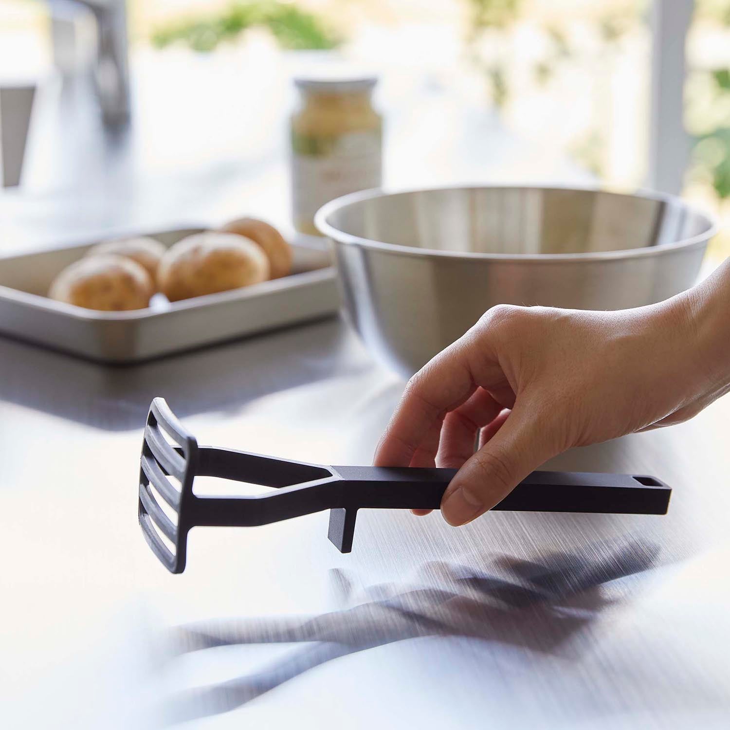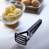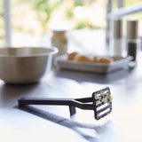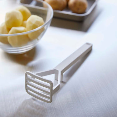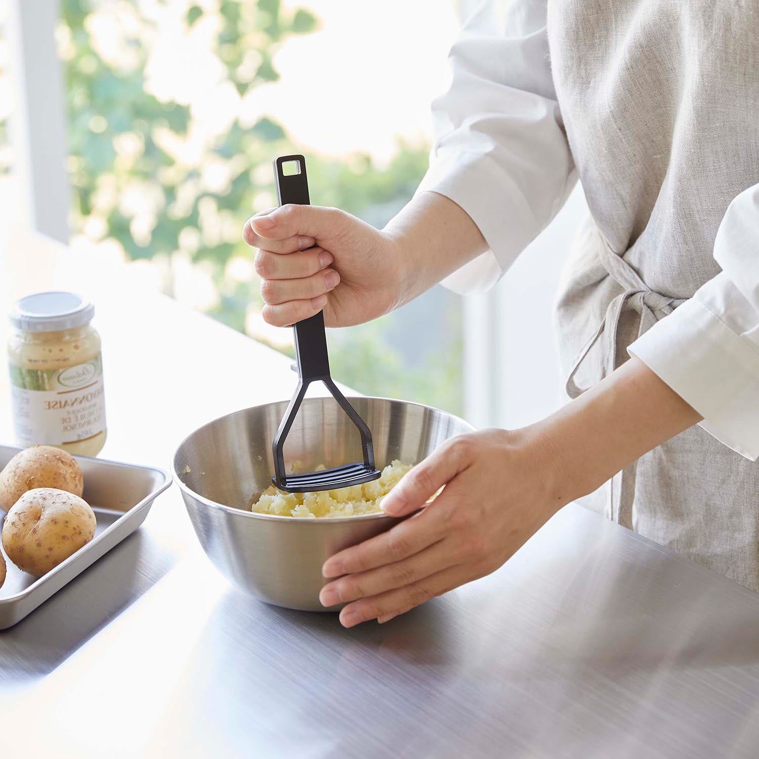 Featuring a silicone handle for easy gripping, this potato masher is designed with a curved shape to fit perfectly in a bowl, making it ideal for mashing potatoes. The mashed potatoes disperse to the sides, preventing build-up at the top of the masher and ensuring smooth cooking. The raised tip keeps it clean by preventing it from being placed directly on surfaces. Made from nylon, it's gentle on surfaces like glass bowls. This potato masher is also dishwasher safe.