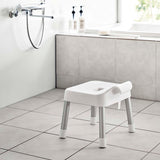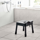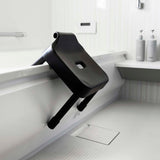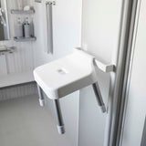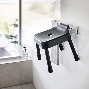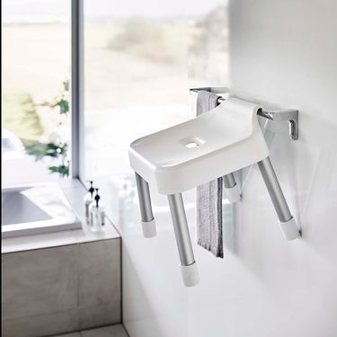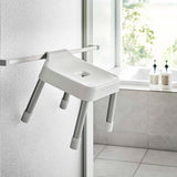 A bath chair with a hook that can be hung on bathroom towel bars to dry.