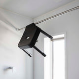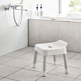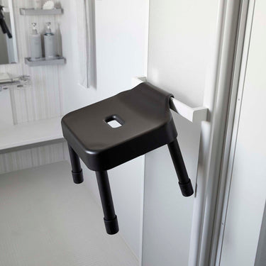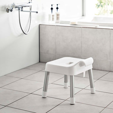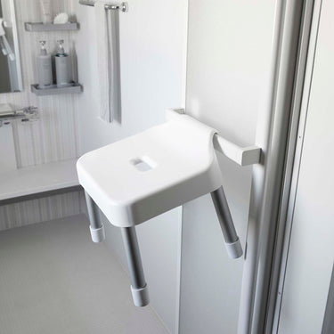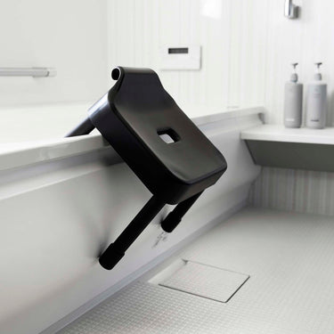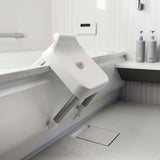 It can be stored off the ground, making it hygienic. This standard size bath chair with a seat height of 25cm is easy to use in any bathroom. It features lightweight and quick-drying aluminium legs. It comes with a plate that can also be hung on a shower hook. If you hang it on the laundry pipe in the bathroom, it won't get in the way when you clean the bath. You can also hang it on the edge of the bathtub to dry. It can even be hung on the handle of the bathroom door. It has a backrest for comfortable seating.