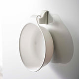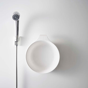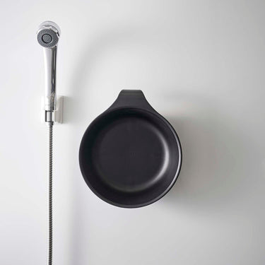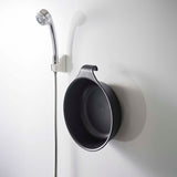 A bath bucket that can be stored by floating on the bathroom wall using magnets.