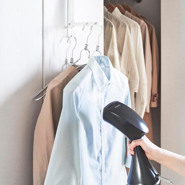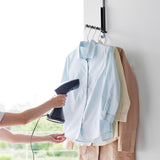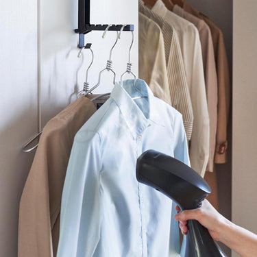Simply hook onto a door for easy installation. A hanger designed for clothes steamers.