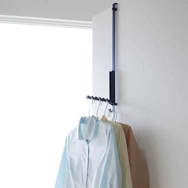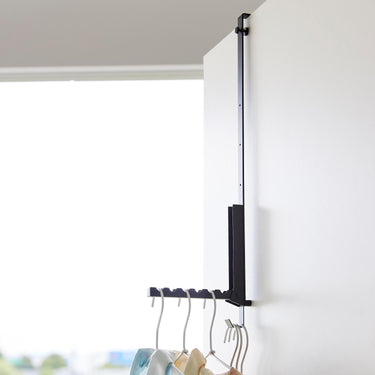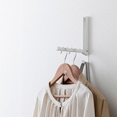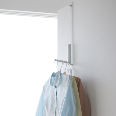 This is a foldable door hanger for your handy garment steamer, allowing you to quickly and easily smooth out wrinkles. Simply hook it onto your door for easy installation. With four adjustable height levels, you can set it up to match the height of your door or your own height. The hanger is securely fixed with two screws, making it stable and easy to hang your garment steamer. It features six indentations to prevent clothes from sticking too closely. The hook at the bottom can also store hangers or sprays. When folded, it becomes a slim design of about 3cm. It can also be mounted on the wall using the included wood screws, and even on the folding doors of your closet. Please note that depending on the type of folding door and where you hang it, the door may not fully open.