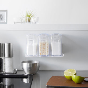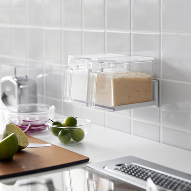 A seasoning stocker rack that can be easily attached to your preferred location using film hooks.