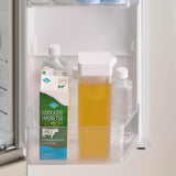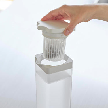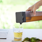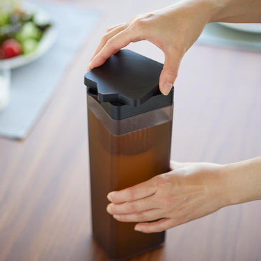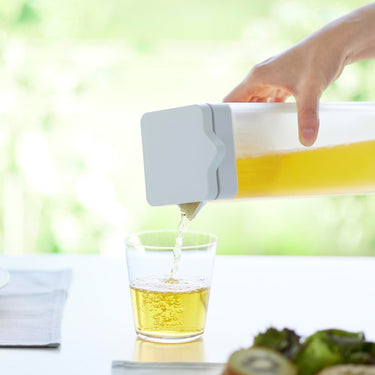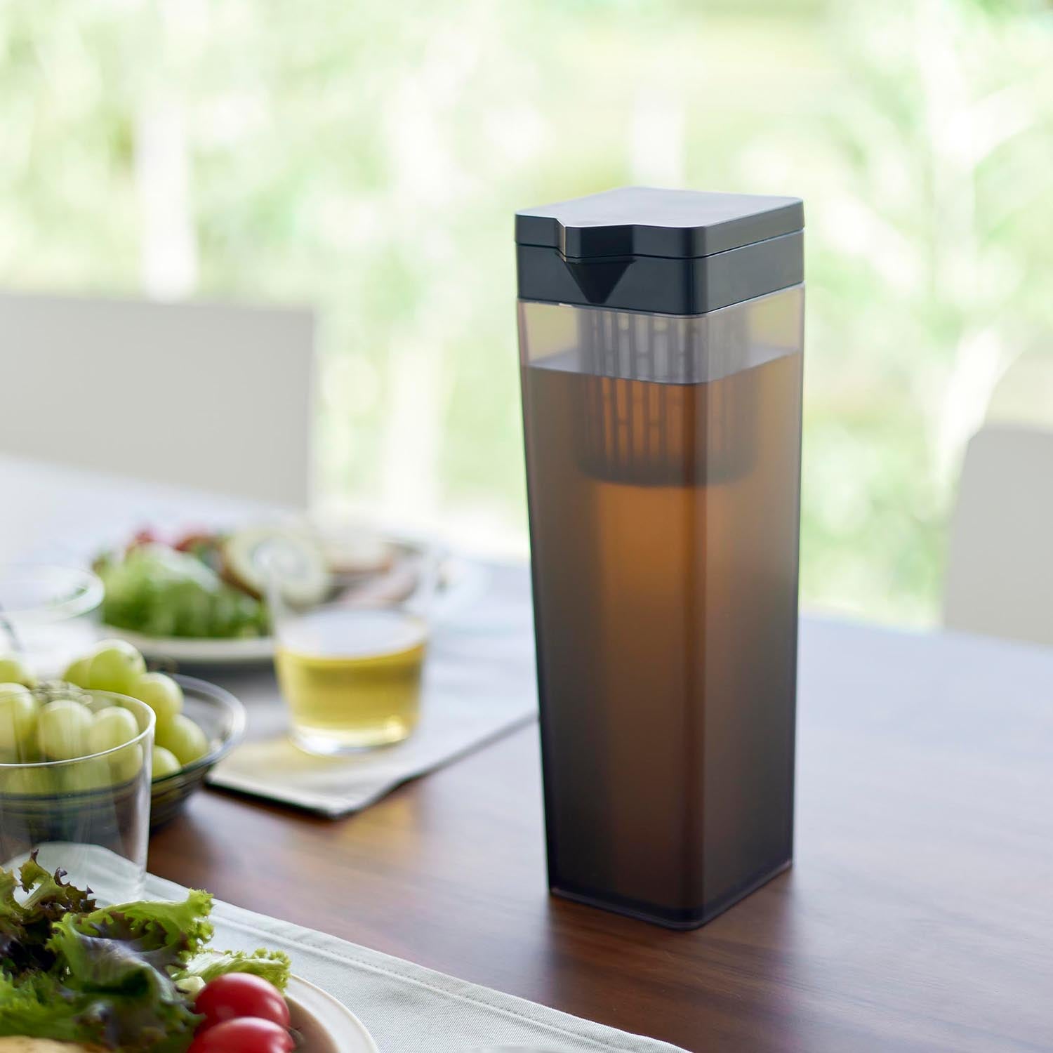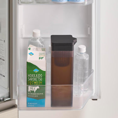 It's designed to not leak even when laid down inside the fridge. When stood upright, it fits perfectly in the fridge door pocket. Its shape is easy to hold and pour with one hand, and it comes with a removable tea bag holder. The parts can be disassembled and are dishwasher safe. For cold water only. Dishwasher compatible.