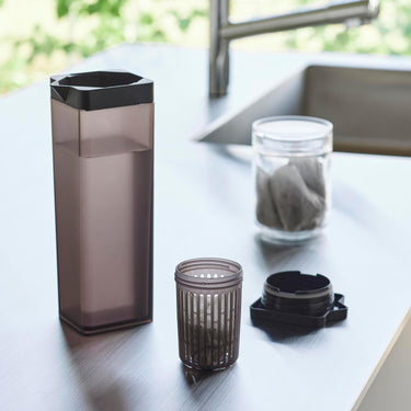 A cold water flask that can be laid down and comes with a removable tea bag holder.
